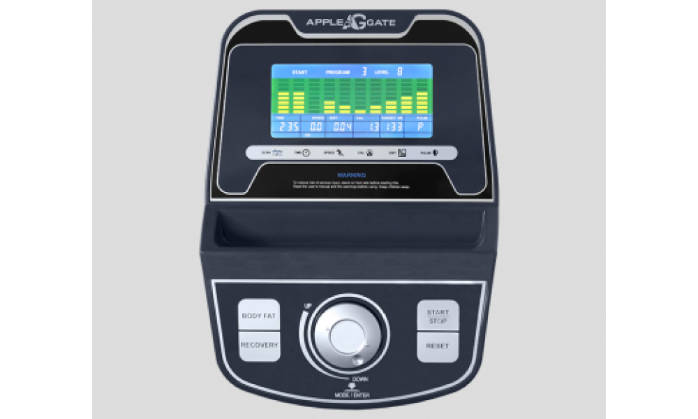 Показания консоли: профиль программ, время, дистанция (за тренировку/общая), скорость, калории, фитнес-тест (Recovery), жироанализатор (Body Fat(%)/Body Type/BMR/BMI)